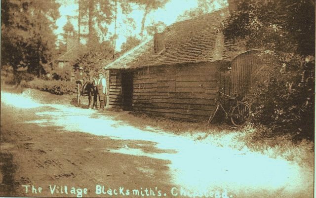 The Chipstead village forge in Hogscross Lane. It was burnt down in 1937, shortly after the death of the last blacksmith, William Shurman (1849-1936). He was a great local character as Charles Gasson indicates. He started work in the forge at 10 and also played cricket for Chipstead, being the last living player to have played on Church Green. He enjoyed a glass or two of home-made wine and always had a cheery word for the children of Hooley as they walked to and from school.