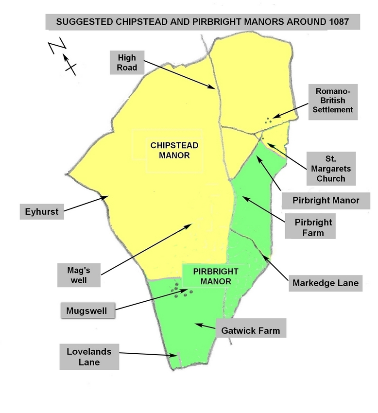 The Domesday Book refers to two manors in Chipstead but there is uncertainty as to where they were. This article argues that the smaller one, Pirbright Manor which was owned by Chertsey Abbey, is in the south and east of the parish.The other, Chipstead Manor, is in the north and west.