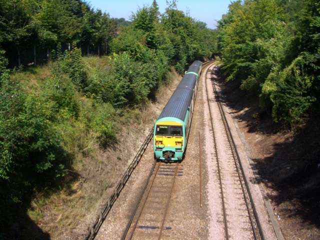 A London bound Tattenham Corner train cutting through the former Walpole estate below Hazelwood Lane in 2007.