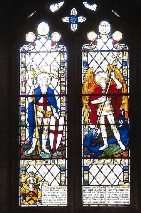 The memorial window to the Walpole family in St. Margaret’s Church, a replacement of the original window destroyed in an air raid in World War 2. The dedication reads: