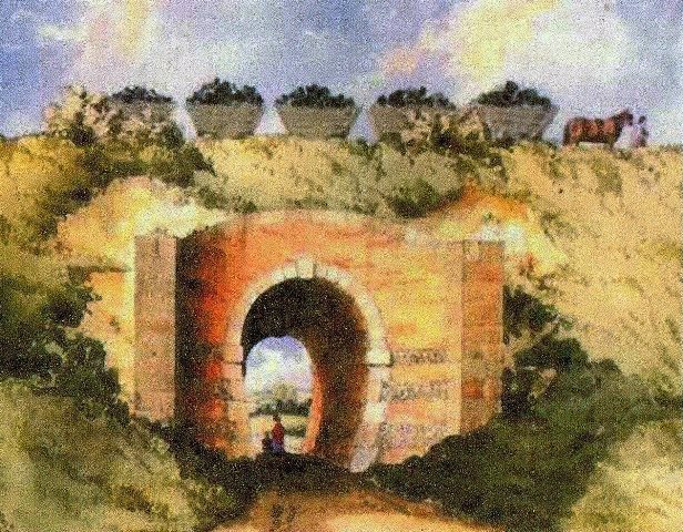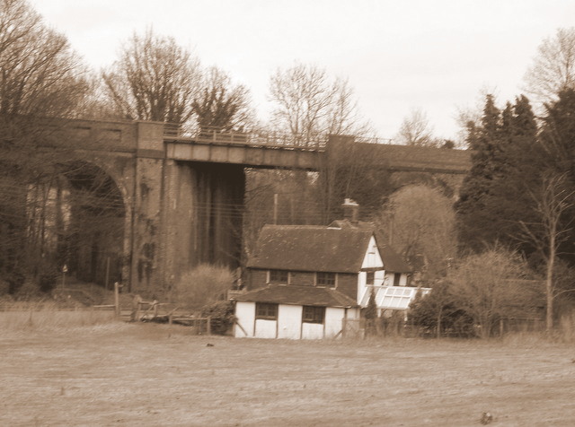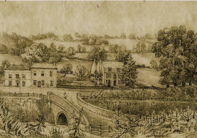 The former Surrey Iron Railway bridge over Chipstead Valley Road, near the current Post Office, c1820. This horse drawn plate railway was mainly used for transporting cut stone from the Merstham quarries to the Thames for transhipment on river barges. The embankments still exist.
