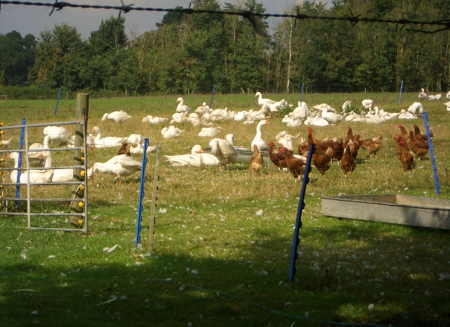 Geese and hens enjoying the sun