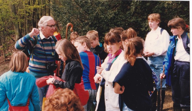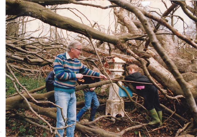 A virtual “Beating the Bounds” in 1988, just after the 1987 hurricane. Christopher is giving “an apprentice boy” a mock chastisement, as per the old tradition, at a Coal Post in Banstead Wood