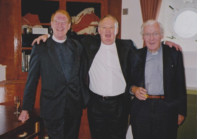 A celebration of John Wates’ ordination on HMS Belfast in the pool of London, following the ceremony in Southwark cathedral in 2003. Canon Christopher Blair-Fish is on the right of the picture and Rev John Goodden on the left, who succeeded Christopher as Rector in 1989