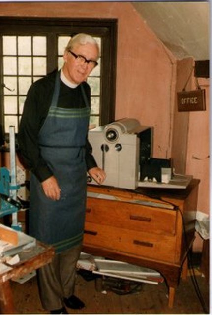 Christopher undertook a lot of Parish duties himself. Here he is printing the Parish Magazine in his attic at the former Rectory in Elmore Road