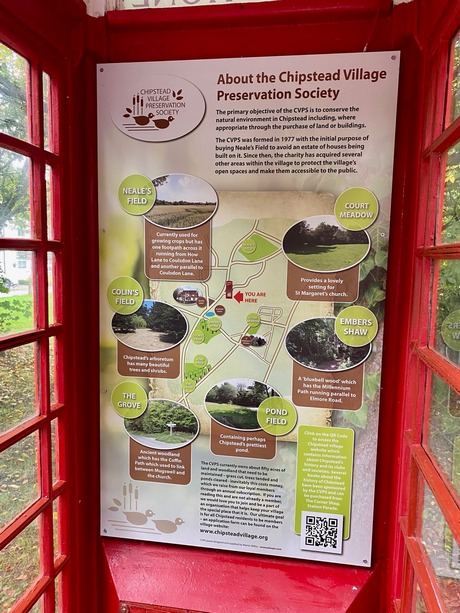 The telephone box on Vincents Green has recently been refurbished by volunteers on behalf of the Chipstead Village Preservation Society. The opportunity has also been taken to install a graphic showing the various bits of land that the CVPS owns. As well as providing what will hopefully be useful information to those wishing to walk on this land, the graphic also has a marketing purpose. The CVPS currently owns about 50 acres of land and woodland that need to be maintained – grass cut, trees tended and ponds cleared - inevitably this costs money. We are fortunate to have about 200 members who pay a small annual subscription. In a perfect world all Chipstead residents would be members – but it is not a perfect world. If you are not a member please join -an application form can be found as an attachment at the end of CVPS section of this website.